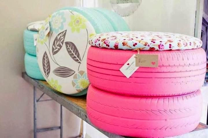 And of course, to put on the deck, we need furniture.  Good old-fashioned lawn chairs and camping chairs will do.  But I’d love to spruce it up with some other upcycled ideas.  Mom has given us a vintage milk can so we can put a round, wooden top on it and make it into a side table.  I love the idea I found on Pinterest using old tires for small tables and stools.  The top could be removable and it could also be used for storage.  Storm coming?  Just take the seat covers inside and leave the tires out.