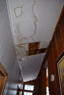 Usually, to check a leak, one would drag a hose up and run water over the roof to find where exactly the leak is coming from. But since we have no running water, we had to just make our best guess. We all figured the culprit was the skylight. The water damage shown above is about two feet directly down from one side of the skylight. The water damage continues in to the middle bedroom in a perfect line. It was a pretty good bet that the water was seeping in somewhere around the skylight and travelling down a joist before dripping through the ceiling tiles.