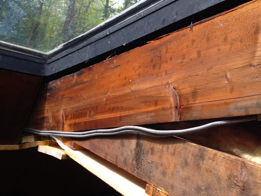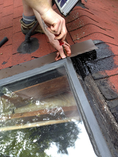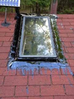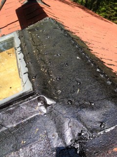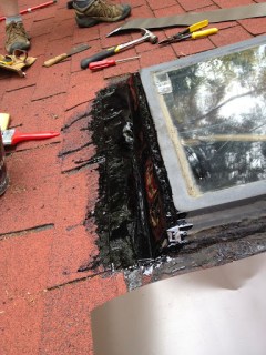 Since the damage seemed to have left the vicinity of the skylight itself, we decided to just leave the skylight in, tar around the seams again, put proper flashing around the skylight and then tar it again. It certainly wouldn’t be pretty but let’s face it, this roof is going to be replaced in its entirety in a few years anyway.