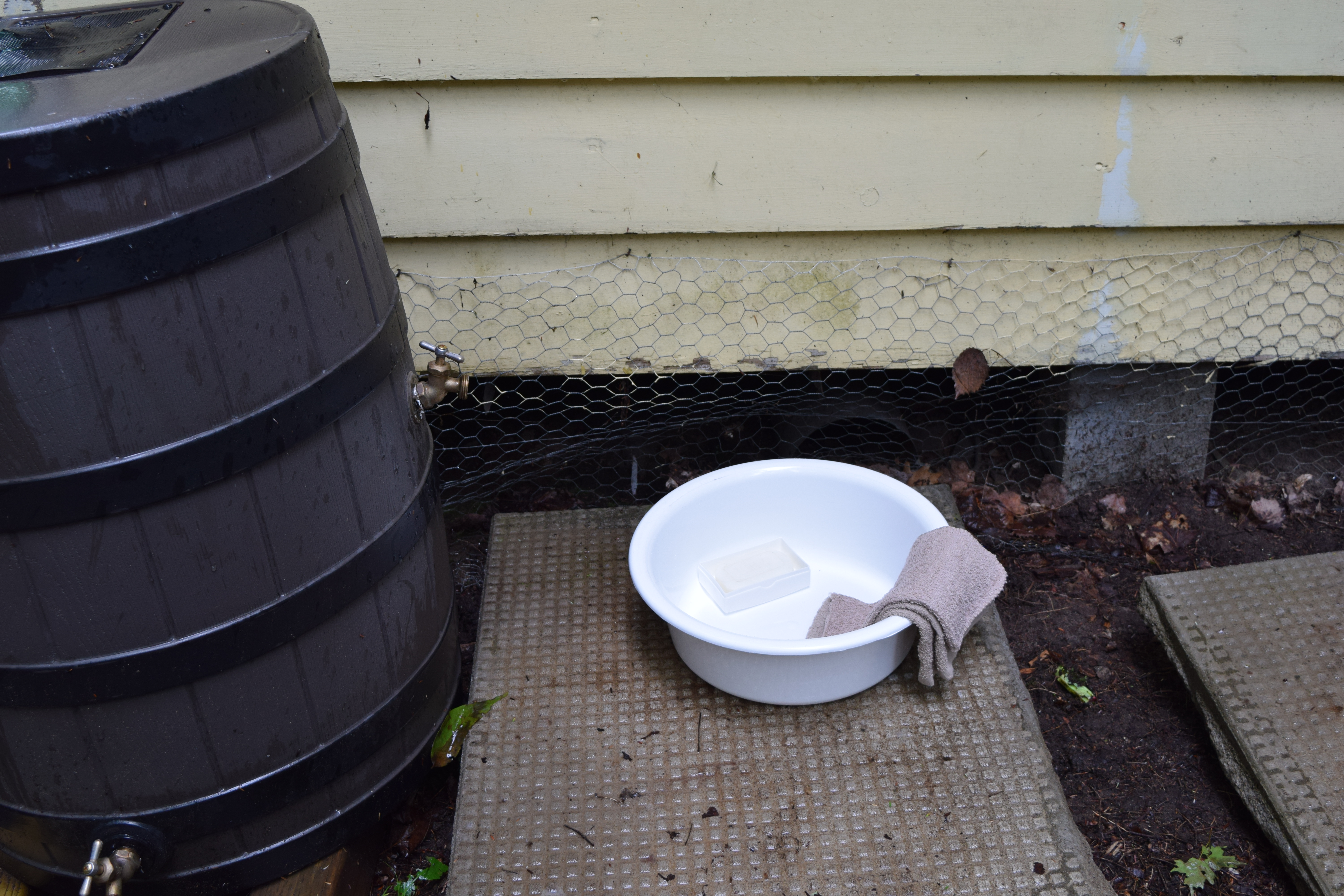 Obviously, a rain barrel is a great solution to the “no running water” issue. But what exactly can you use rainwater for? First of all, it comes off the roof, which collects all sorts of interesting things and then it goes through the eavestroughs, which can also get pretty dirty. It will carry whatever toxins and contaminants into your rain barrel that might be on your roof and in your eaves (mould, bird poop, etc,). Rainwater can carry parasites, bacteria, viruses and chemicals and has been linked to disease outbreaks. Also consider that rain blown through populous areas gathers toxins from pollution. The quality of rainwater can also be affected by the frequency of rain (or lack of it), the season, the environment (urban vs. rural) and by other contaminants in the air (soot or smoke). All of these things makes rainwater impossible to drink. And if it’s impossible to drink, then to what degree is it safe to wash dishes or wash our hands? In the city, the water is used for lawns and gardens but out here in the woods, what can I do with 190L of beautiful rain water?