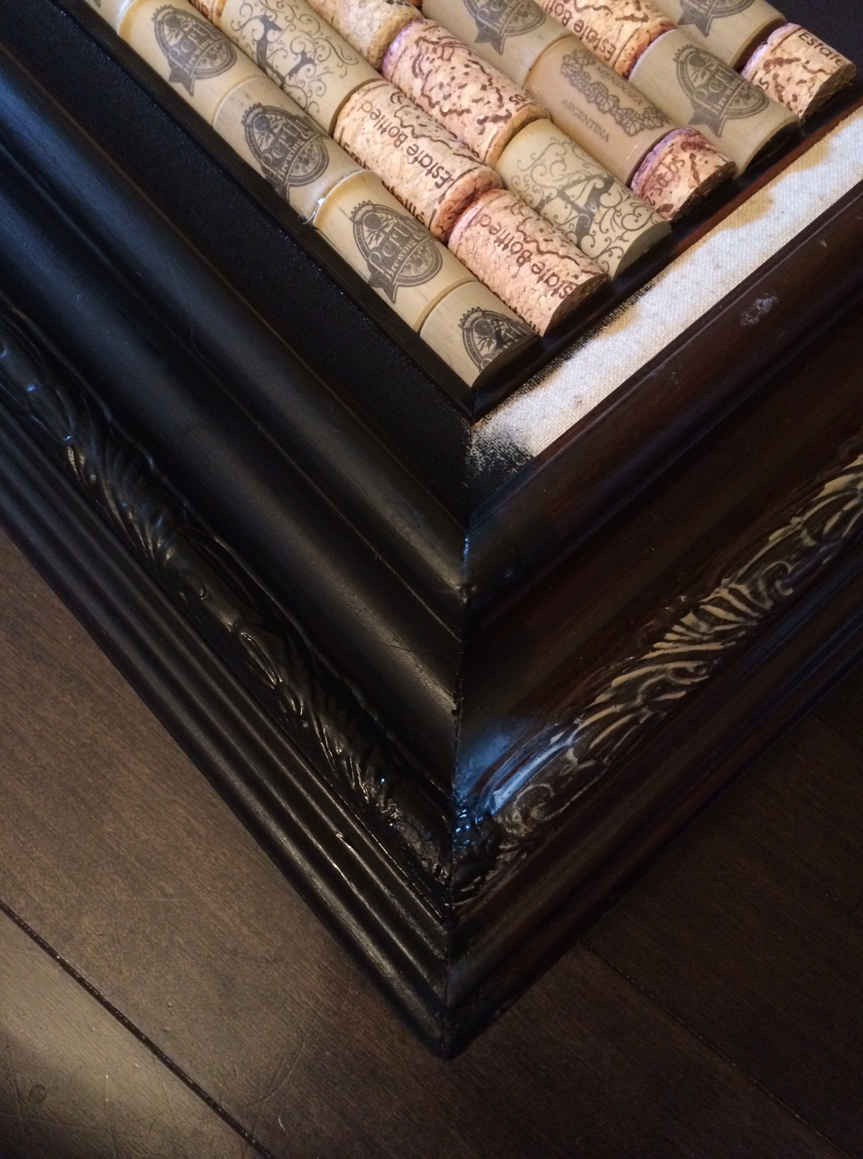 As I started to glue them on, the colouring of the frame started to annoy me.  I thought maybe I could use it as-is, but with the oldish-world look of the corks added to the oldish-world look of the frame, I knew that the Sons of Anarchy dartboard would lose its cool factor.  Using dollar store craft paint, I simply painted it black.
