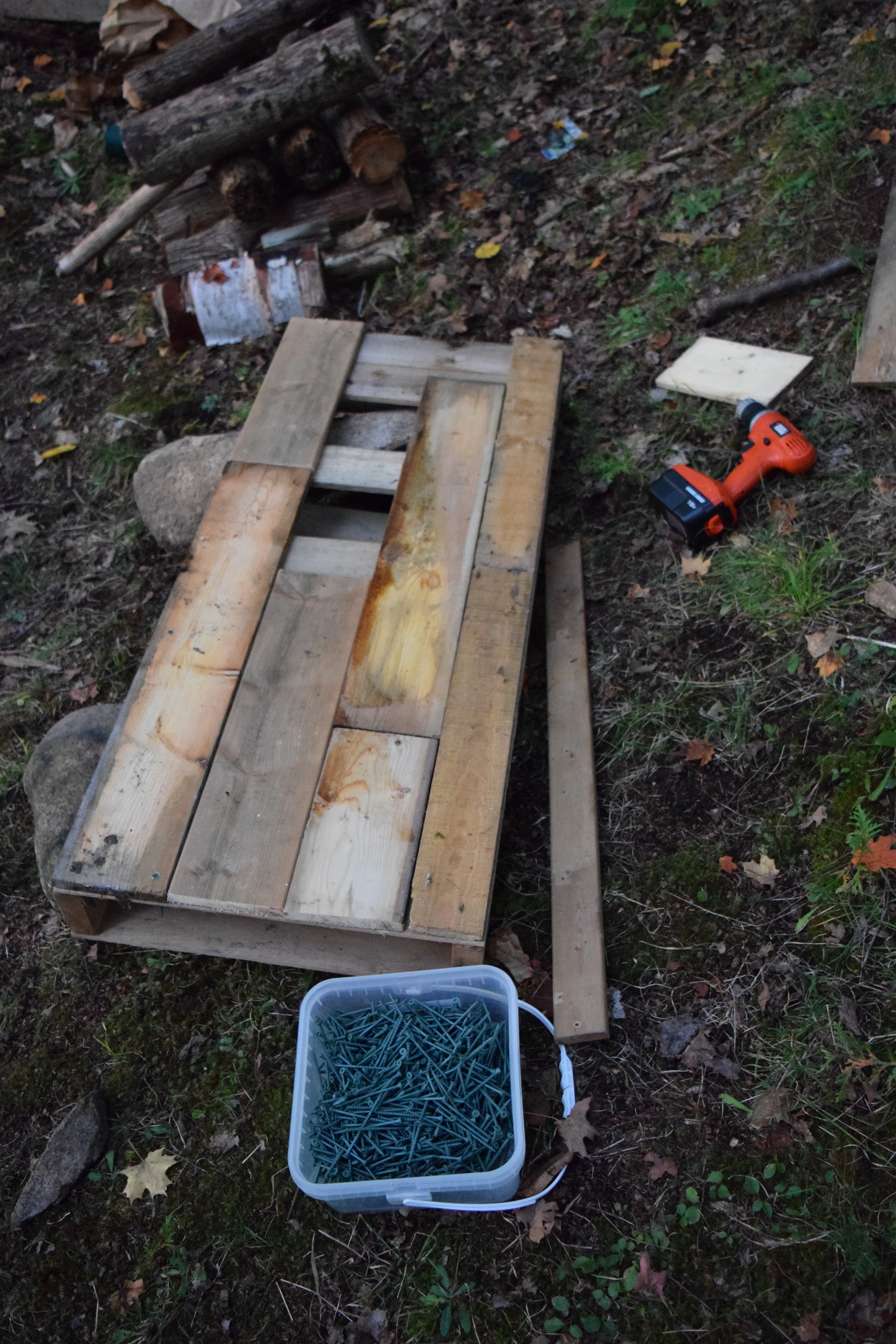The massive stones that I had unearthed from the original firepit were so heavy, I had just left them by the fireside. I put two of them on the slope. Then I went to the back of the shed to check out our pallet situation. I figured we could cut one in half to make a loveseat-sized bench. Lo and behold! There was not one, but two the perfect size already!