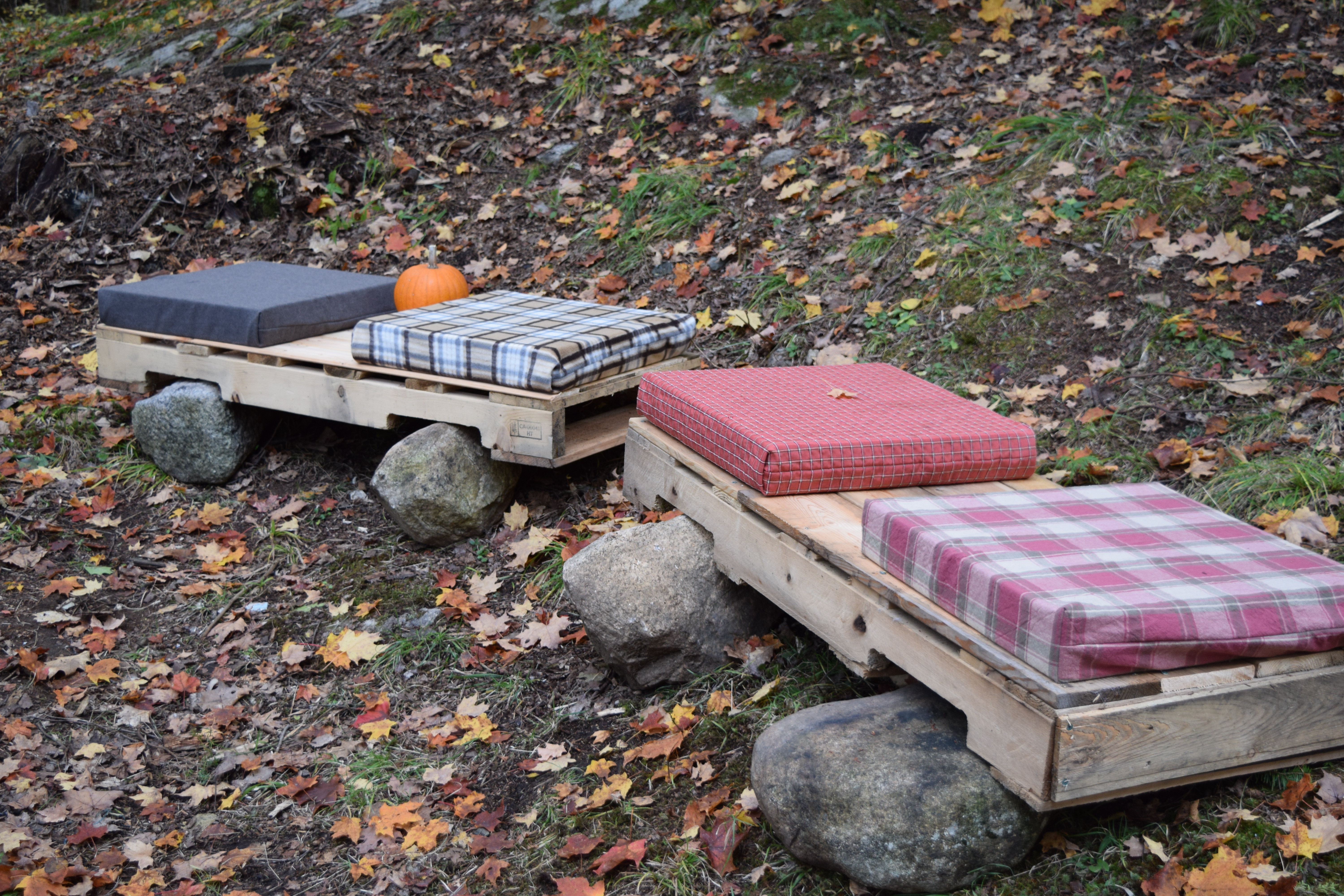 With some shuffling and rotating the rocks, I balanced the pallets so that is actually a very stable seat. The back edge of the pallet simply rests on the sloped ground and the front edge rests on top of the rocks.