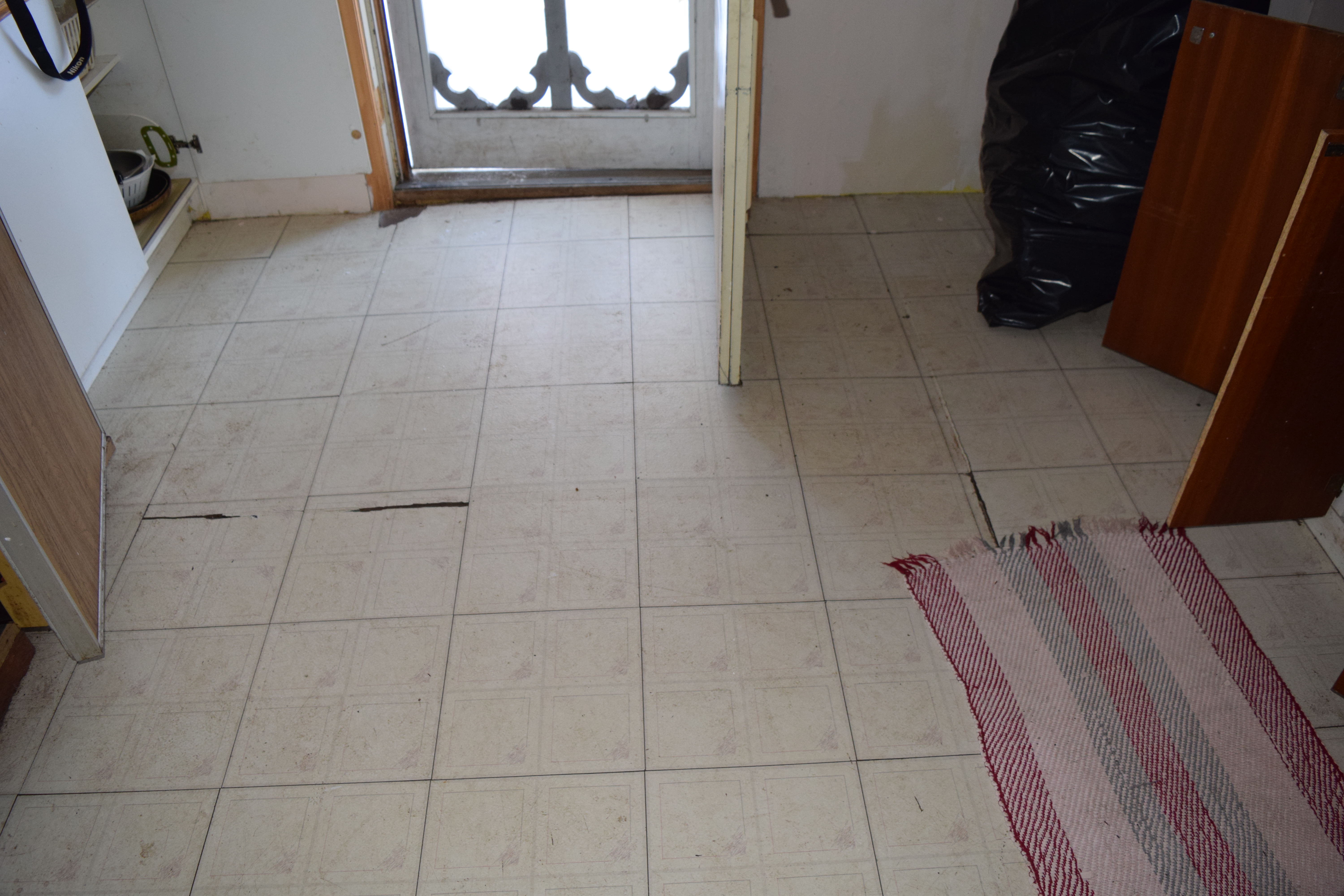 Shelves from an old bookcase went up on the walls (again, open space to easily clean and deter mice from setting up house), glass jars for foodstuffs (mouse-proof), and the knives were mounted on the wall to maximize working space. The mounting brackets under the shelves we had lying around in the shed.  Why aren’t they centered?  We only had six of them and the centre bracket is the only stud in the wall…sigh. We moved the water jugs over to the sink side of the kitchen where they belong (finally!) and bought a double-burner camp stove. Oh, the joy of not having to go out into the rain in the summer just to boil water for my morning coffee. We had only the floor left.