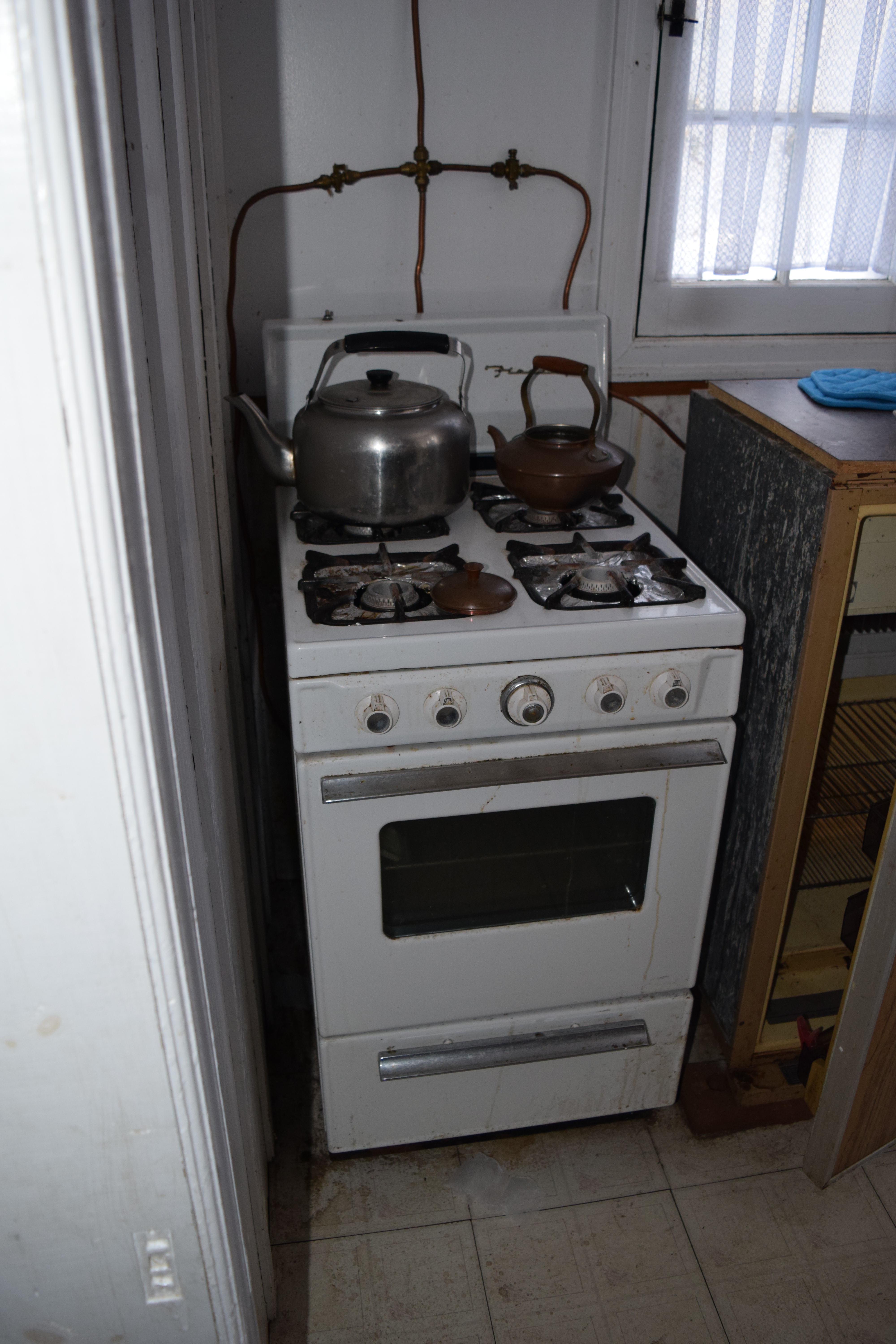 This year, we finally got rid of the propane stove in the corner.  Little did we know it was where the mice had been happily living for god knows how long.  (I can’t think about it too much or I start to feel throw-uppy.)  And behind it was a disaster.  The wall it was beside was covered in old grease. And the wall behind it, covered in shredded wallpaper of the same lovely retro pattern as was in the cupboards.