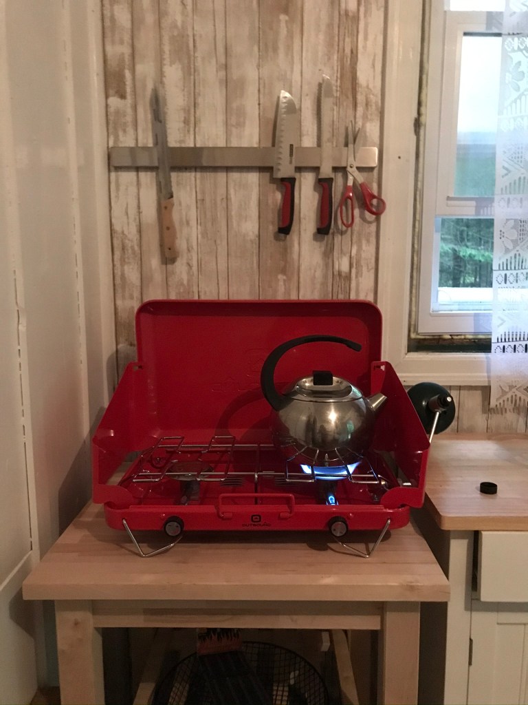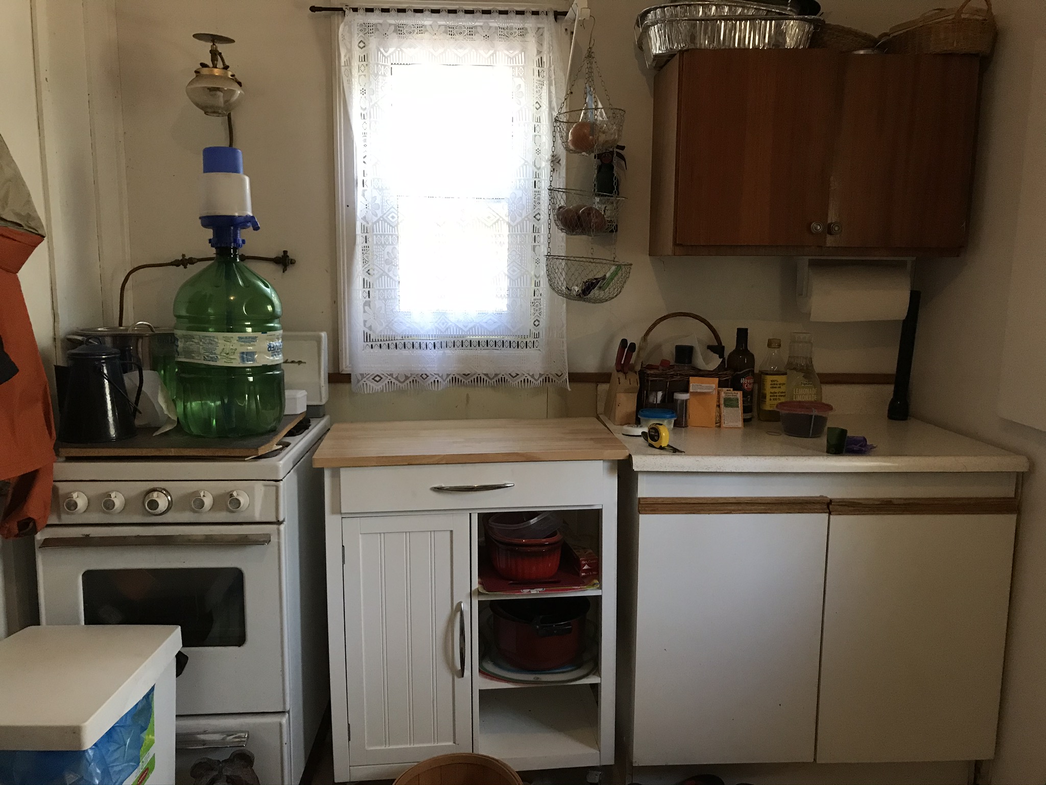 When we first bought the cabin in 2014, I had painted most of the cupboards white and repainted the walls the next spring. I wallpapered the inside of the cupboards to look like stone, from scraps of wallpaper we had leftover from a city house project, instead of the lovely psychedelic yellow and orange flowers that had been in there for the past three decades. We also got rid of the old, dead propane fridge and bought a new island from Canadian Tire.  This doubled our work and storage space.  It’s pictured below in front of the window. Last year, we put in a new window as well so now we don’t lose space with the old window swinging out over the island.