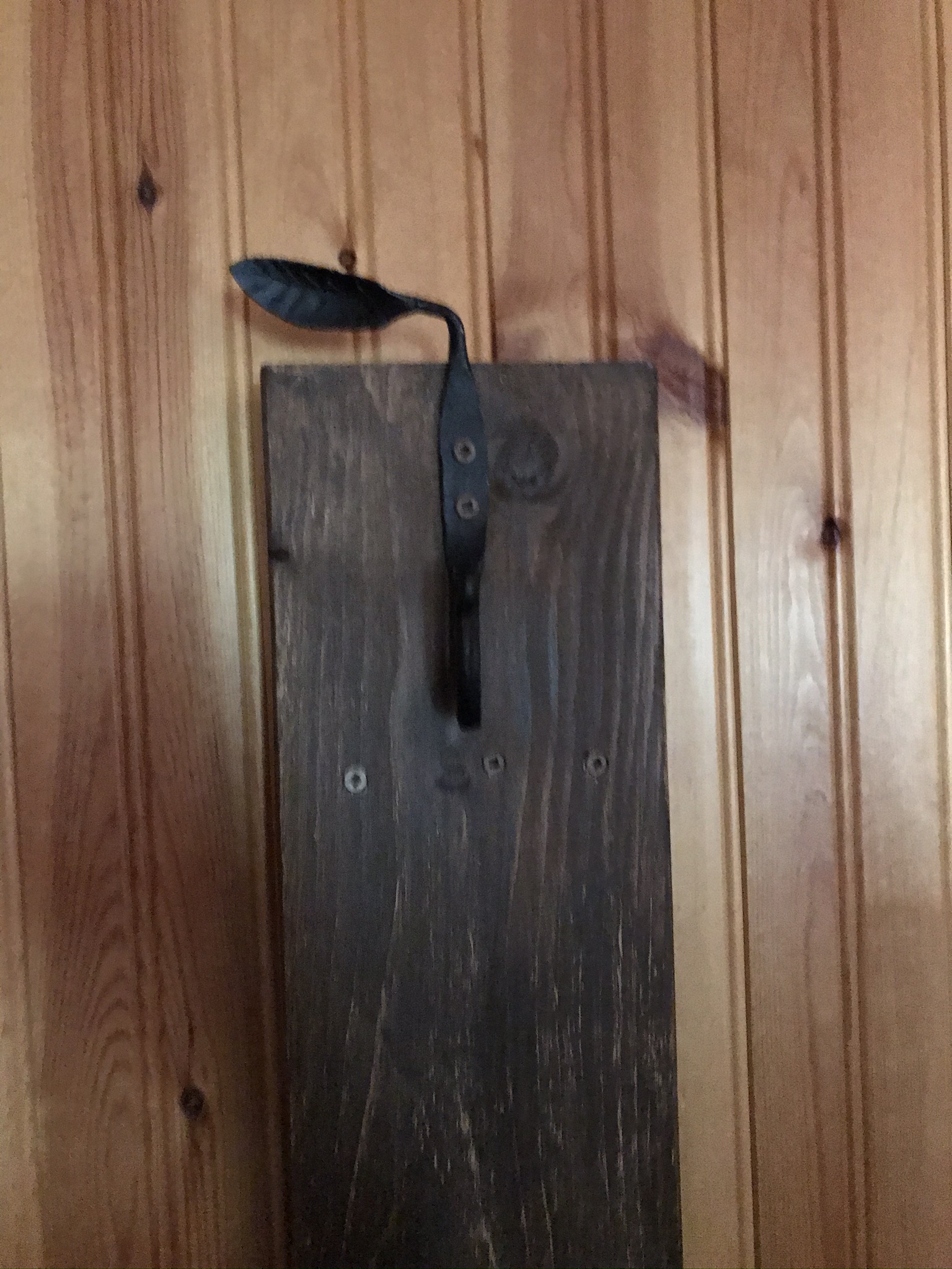 We have five skillets of different sizes, two different sizes of dutch oven and a grill.  Until now, they were unhappily stored in several stacks on a bench that had once been used to actually sit on.  But cast iron is heavy and I had no idea how to store them efficiently.  I searched Pinterest and loved how they looked hanging.  Some ideas I liked had the support boards attached to the wall horizontally, which was our first idea.  We happened to find three pine boards in our stash of leftover lumber that were exactly the same size.  What luck!  I stained them with the leftover outdoor stain we have from all the other things we’ve created and let them dry.   We asked a friend who is a hobbyist forger (smith?  Not sure of the proper word.) to make us some hooks.  He happily obliged.
