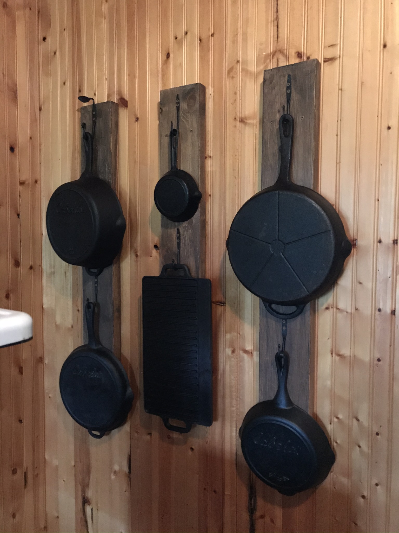 Next up, cast iron cookware storage.  Because our cabin is off-grid, we cook with either a BBQ or our small, wood-burning campstove.  If we’re up for adventure, we sometimes cook over the campfire.  So our main cookware is, of course, cast iron.  I don’t think I can put into words how amazing it is to cook in cast iron over wood heat. It’s just about as real as you can get and it’s not as hard as you might think.