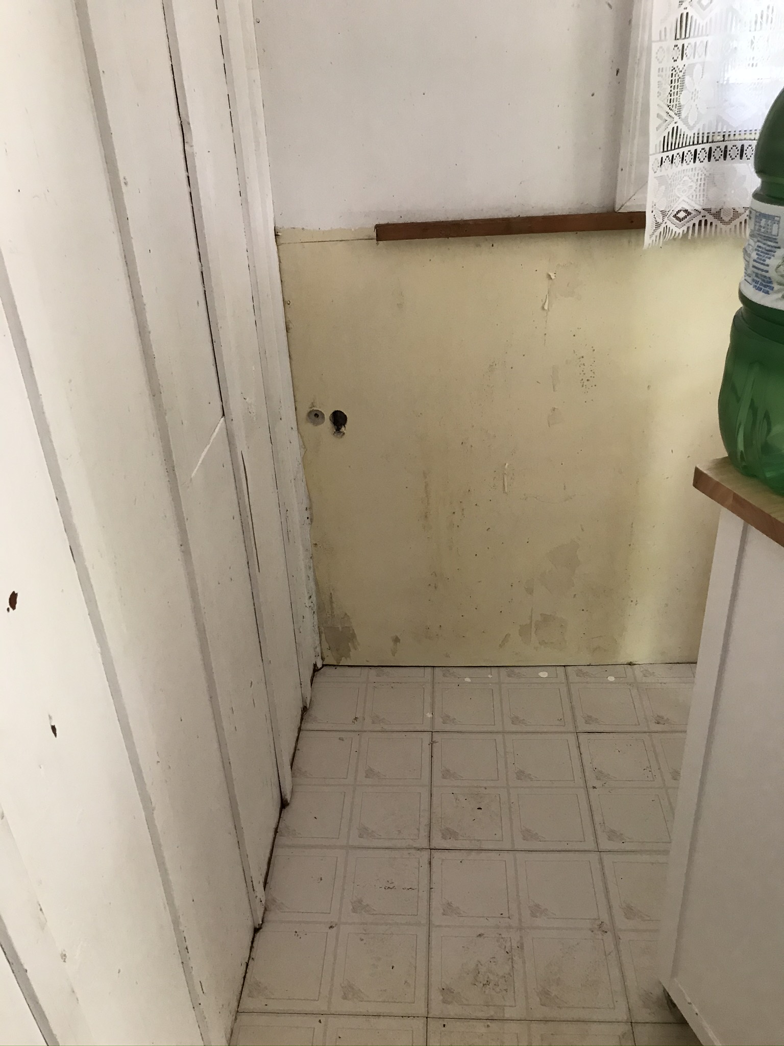 Then I moved onto the walls.  The first thing to go was that ugly fake-wood cupboard.  The two side walls got a good scrubbing and then a fresh coat of white paint.  The wall behind could not just be painted due to all the holes in it.  Steel wool was put into the deepest holes (everything we do is for the purpose of deterring mice) and then I bought self-adhesive wallpaper from Home Depot.  I wondered if it would look cheap or if it would even stick in our ridiculous humidity so I just started with the first roll and decided to leave it for a few days to see if it started to peel off.  It didn’t! So I finished the wall and I love how it looks!  Also, this wallpaper has a plastic coating on it so it can easily be wiped down.