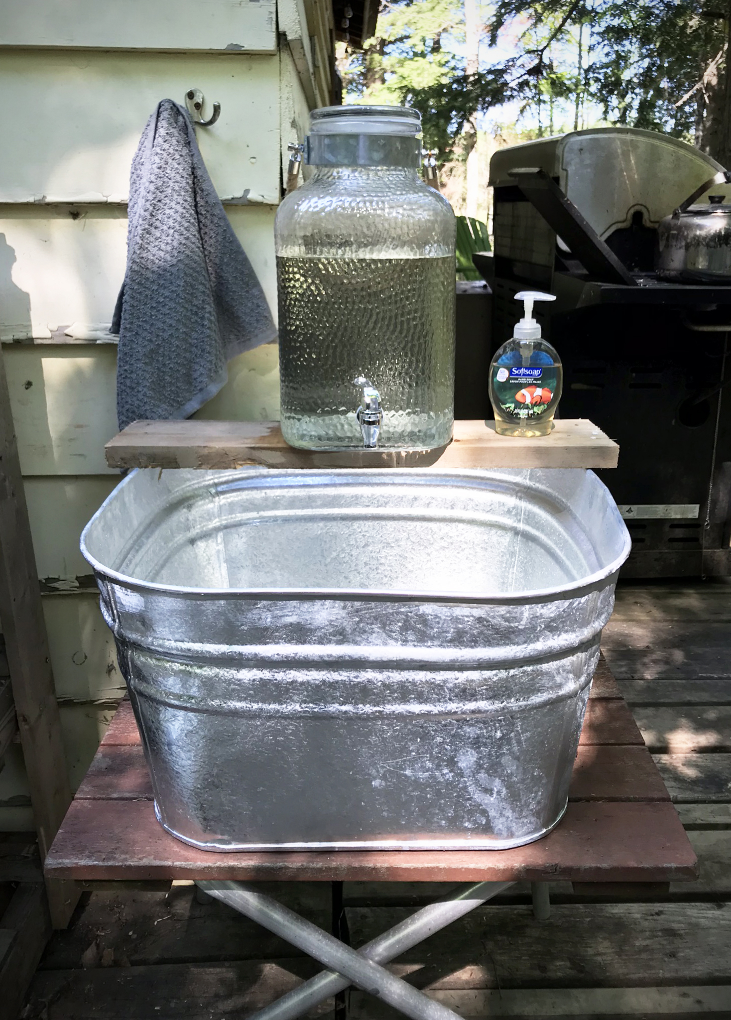 We finally upgraded our little outdoor hand-washing station from a white bucket and a 4L plastic jug to a galvanized steel washtub and a drink dispenser that holds 8L of sun-warmed, T-shirt filtered water.  Honestly, now washing our hands feels decadent! A couple of things to remember…dump the washtub before it gets too heavy and always poke the hand towel a couple of times before taking it off the hook because wolf spiders love to hide under it.