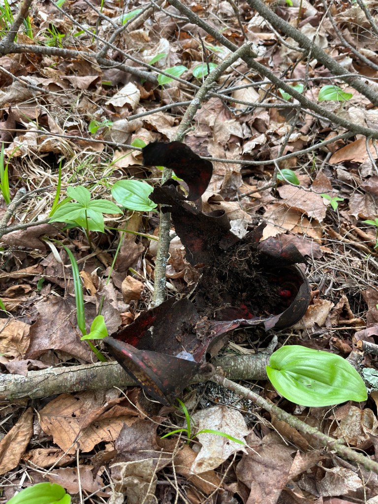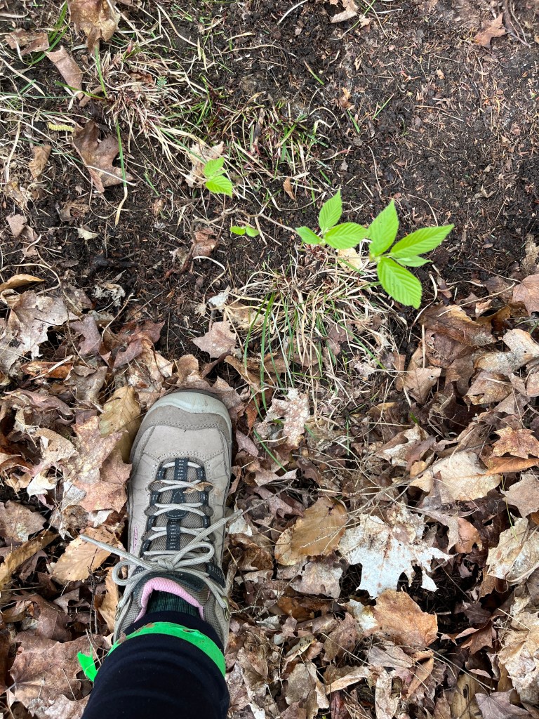 The first thing we did was walk around the property with flagging tape to map out the possible perimeter. We maximized use of the trees so it is definitely an irregular shape. This way we had a good idea of the size of the area and could easily modify it if we felt it was too small. Then, we started building paths. We meandered through the smaller trees, trying to find a natural route so we didn’t need to uproot too many saplings. It was surprisingly easy. I raked the leaves to the side to make sure there wasn’t anything dangerous hidden underneath. It’s a good thing I did because we found several pieces of dangerous debris – a broken beer bottle, a rusted can, not to mention a rodent hole (broken galgo leg for sure!) and spear-like roots which could definitely cause some damage if stepped on. I had to uproot some tiny saplings but for the most part, we made an interesting zoomie path for them, with a couple of different routes. We didn’t have the fence up at this point but having these paths already cleared certainly made it easier for us to see the perimeter and work in the area as well.