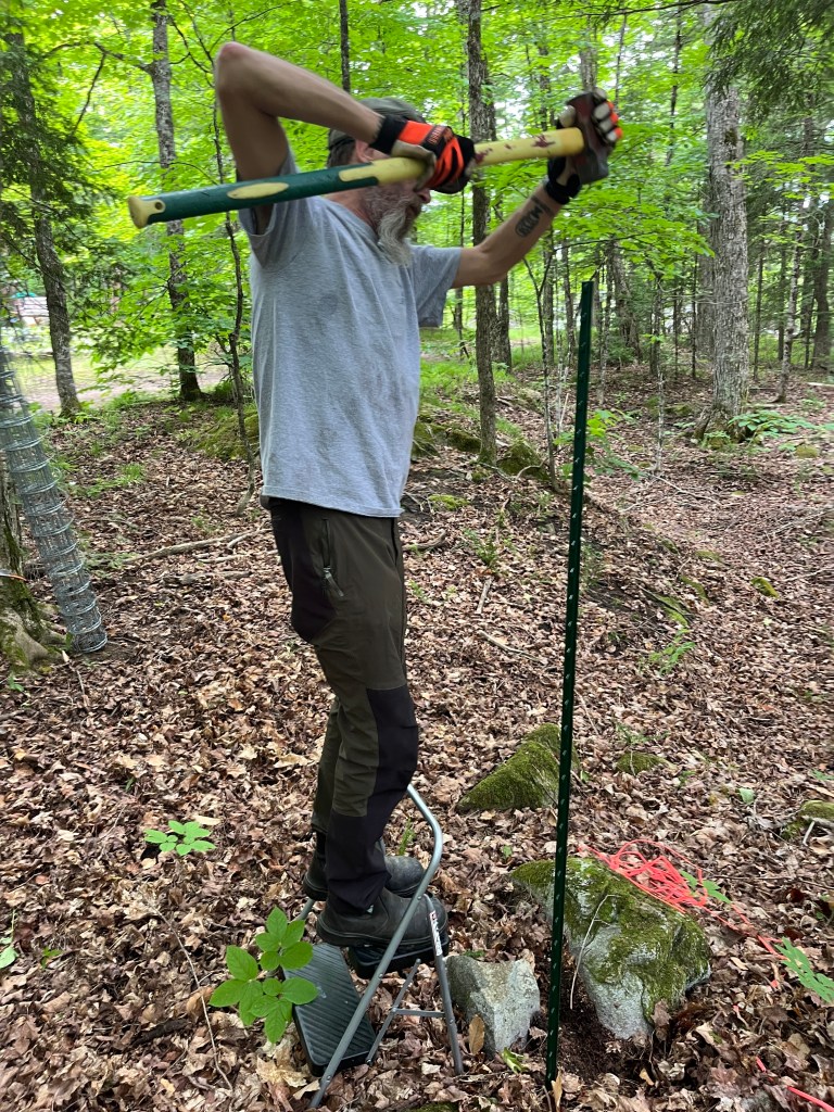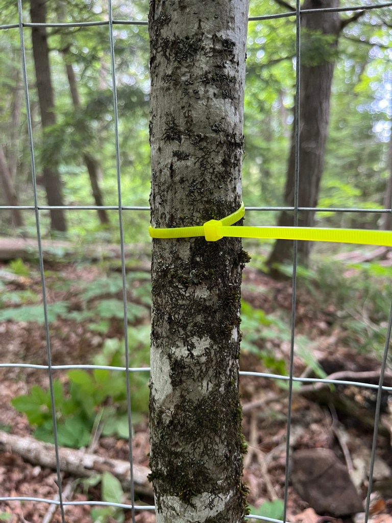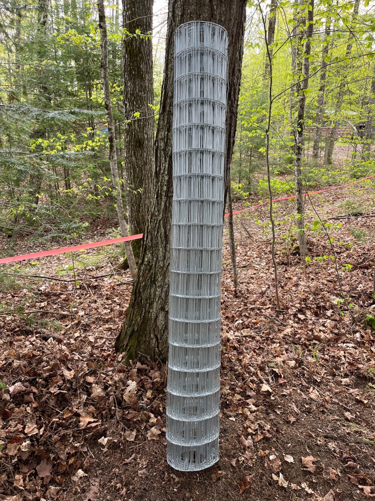 The plan was simply to use the trees as the fence posts where we could and then fill in the larger spaces with T-bars. We wanted to do this because we wanted the option of taking the fence down and returning this fenced space to a completely natural space if we wanted to in the future. Doing it this way, we only needed to buy 6 T-bars. We found the 14-gauge fencing to be light enough for me to lift (awkwardly) on my own, fairly easy to unroll and sturdy enough to withstand the dogs, should they decide to put paws on it. It was also easy enough to bend the ends together from one roll to the next. To attach them to the trees we first wrapped bungee cords around the fencing and trees. These were just to hold the fencing in place while we worked out the perimeter. We used zap straps to attach them to the T-bars. Once the perimeter was in place, we tied forest green paracord around the fencing and trees and T-bars at the top, middle and bottom to ensure stability (when snow piles up) yet flexibility (when the ground heaves) over the winter and removed the unsightly, brightly-coloured bungees.