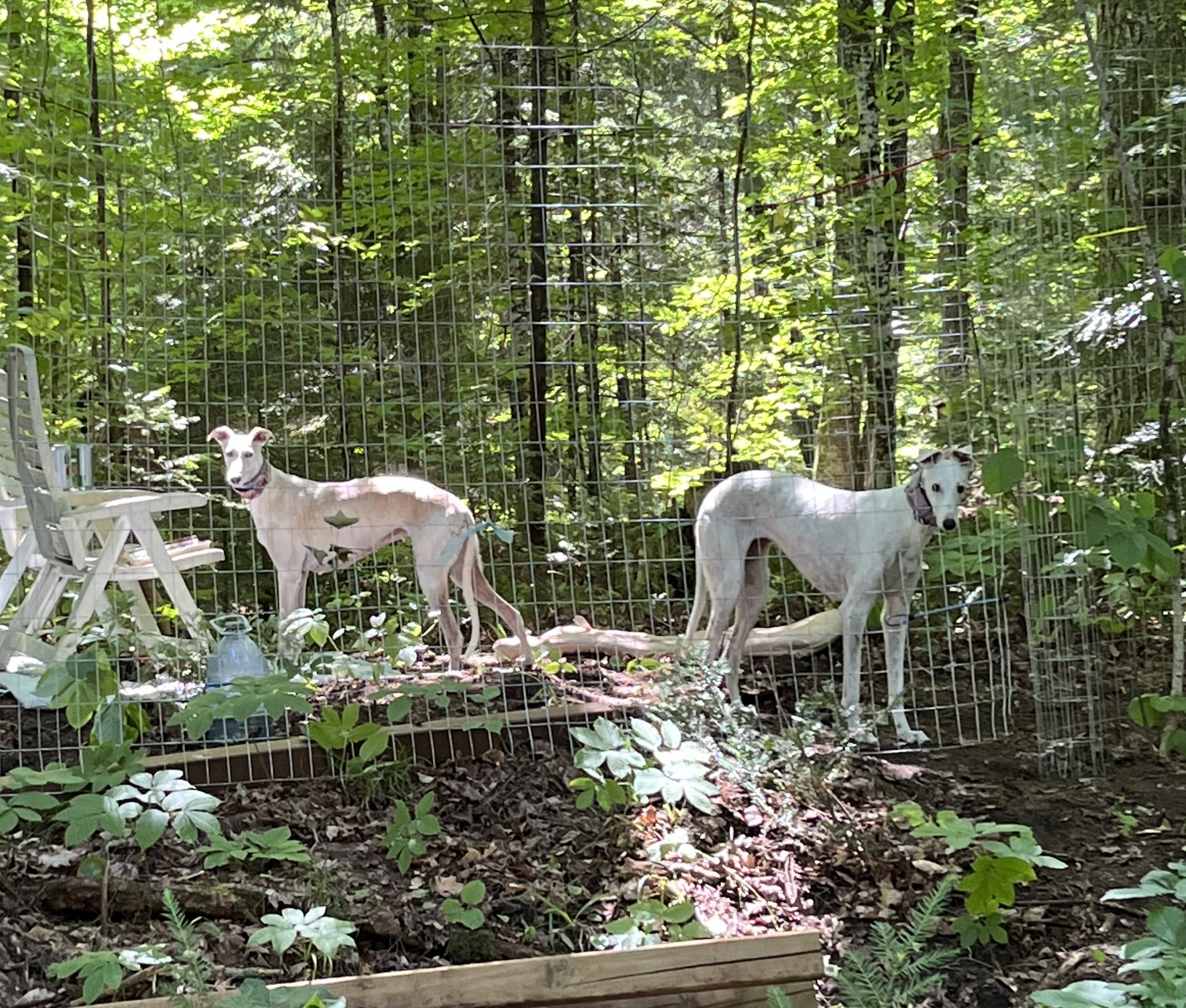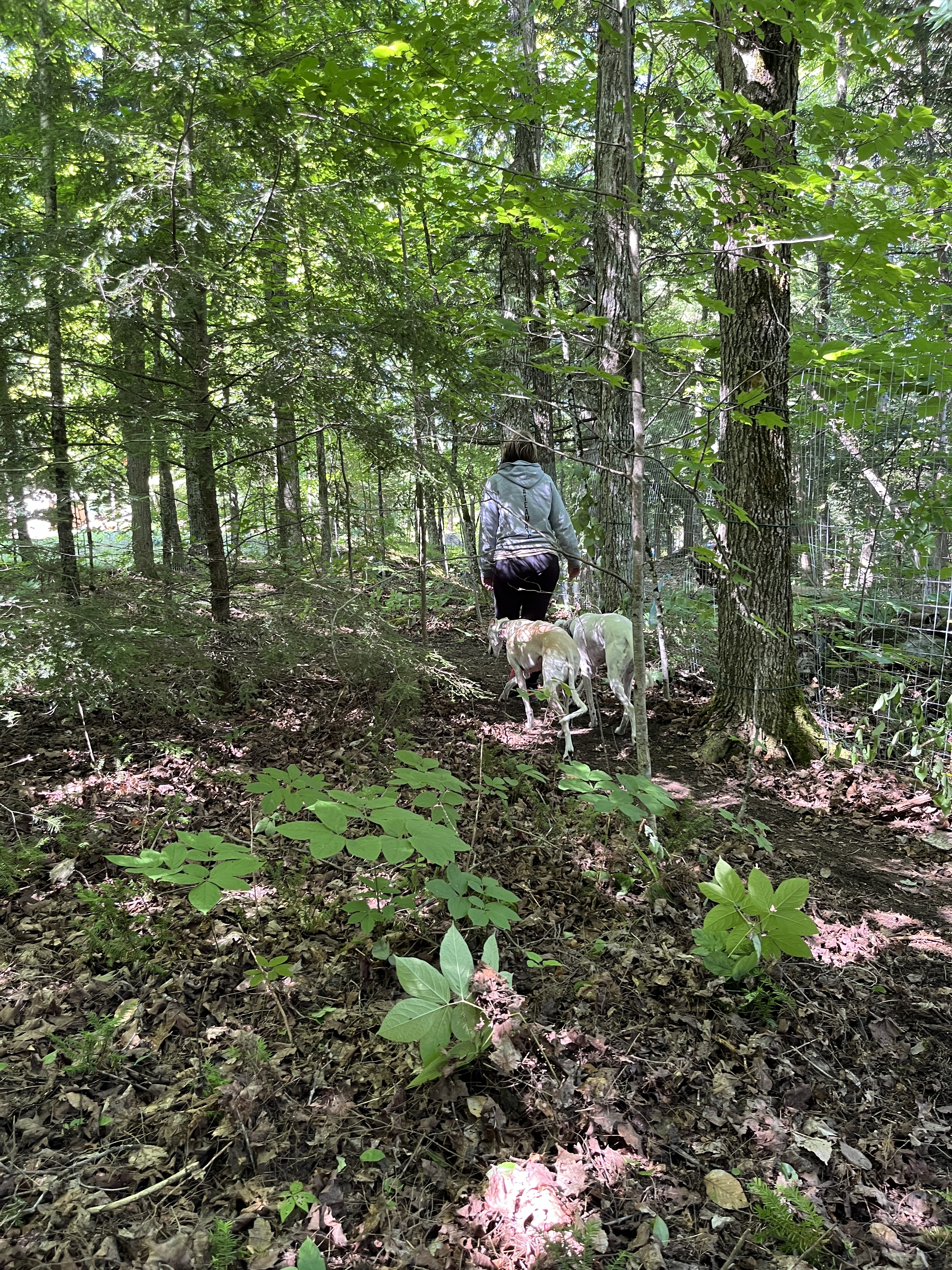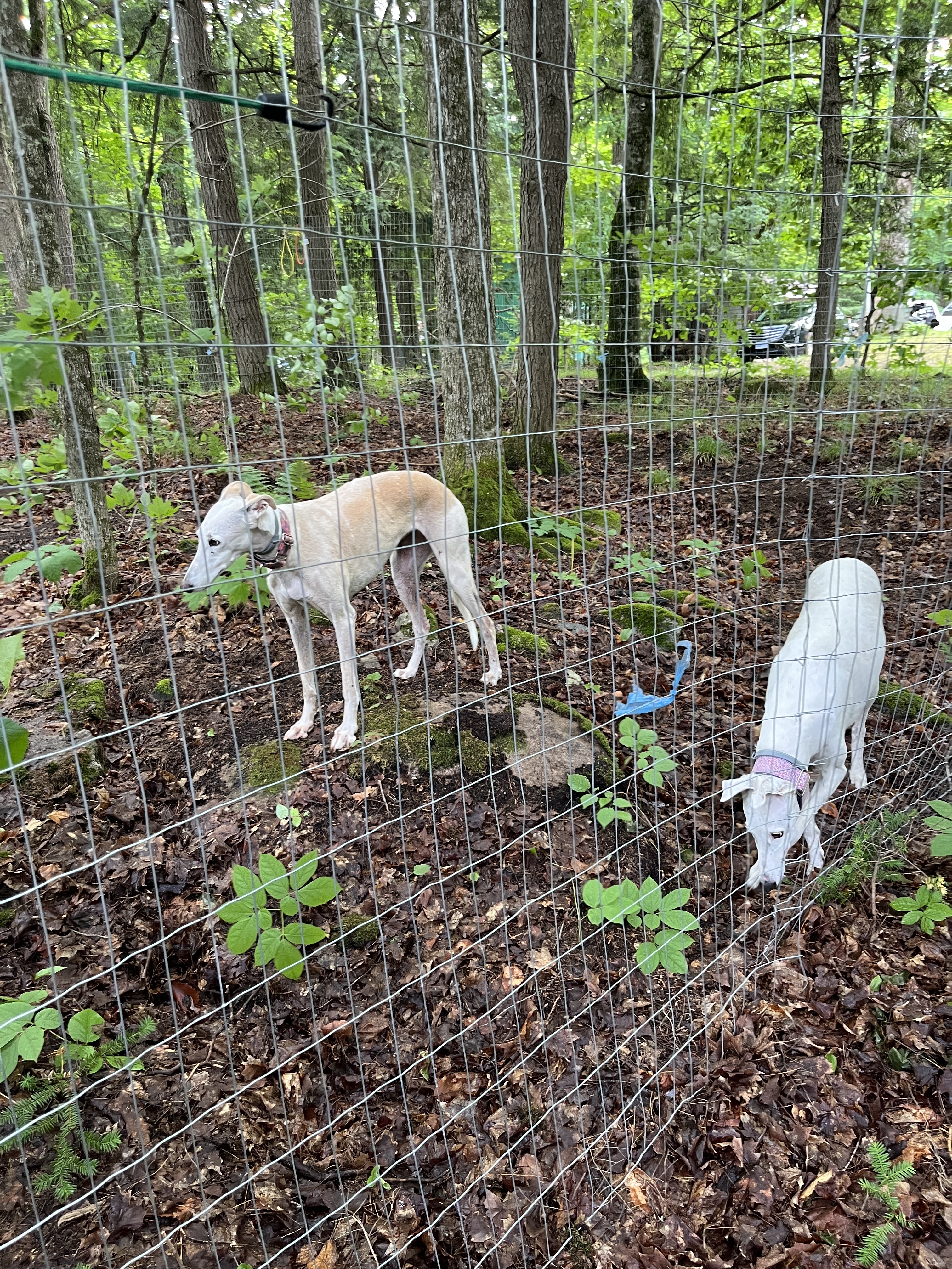 While visiting Finnobi Forest, it reminded me of the land we have at the cabin. Our one-acre pie-piece is mostly wooded area that we aren’t using. What if we put up a fence and let our two senior ladies have some off-leash time? An idea was born.