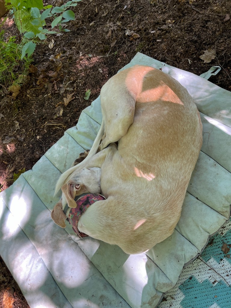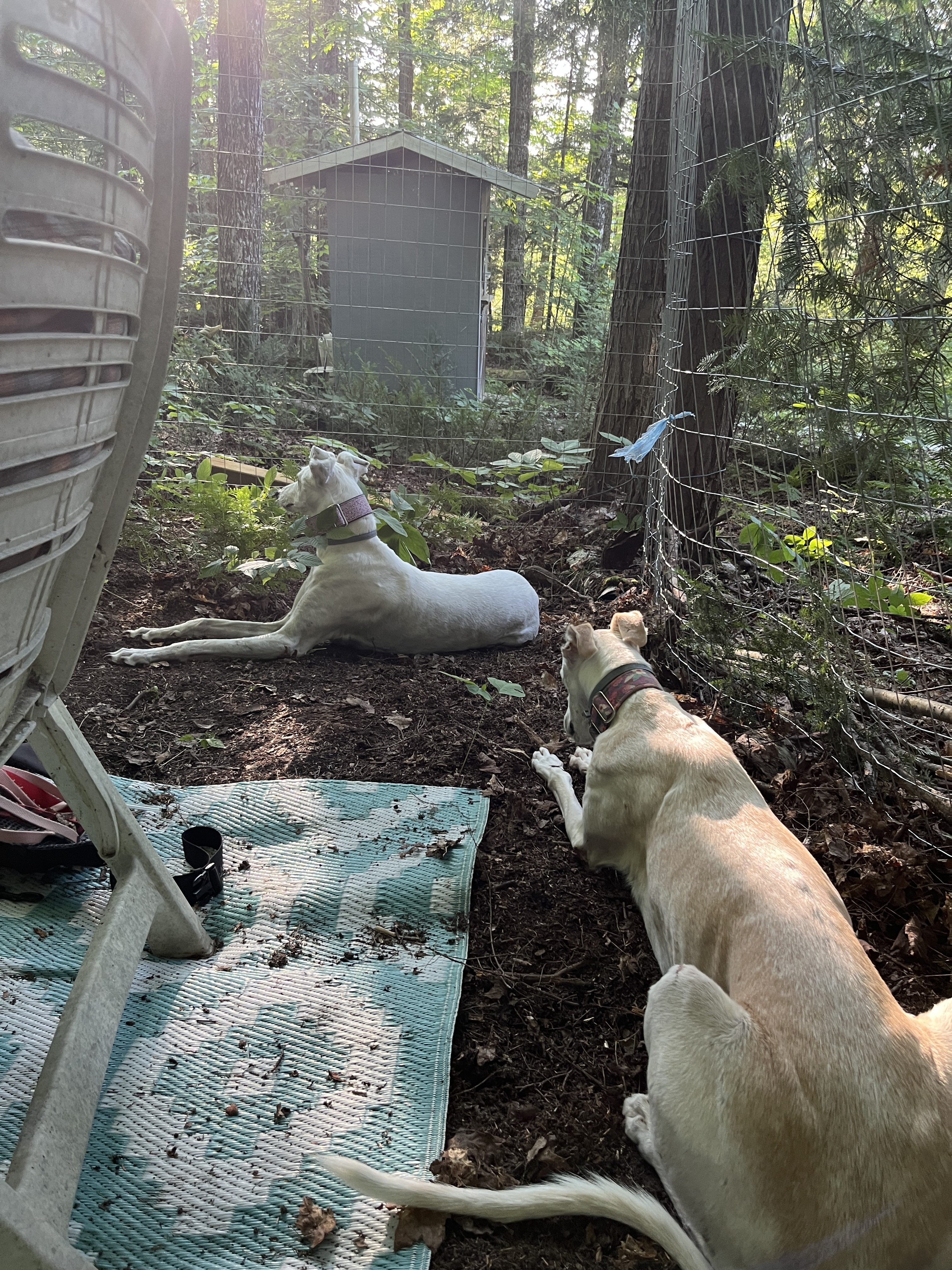 It is still big enough for them to do an early morning or late night bathroom break without getting kitted out in their harnesses and double leads (two leads – one on the harness and one on the collar – because they are incredibly strong and wily). They still need to be on lead of course to get to the enclosure since it’s not attached to the cabin but it will be easier and more comfortable for them to just run in, do their business, have some early morning/late night sniffs of the neighbouring critters than taking them on a walk around the “loop” (the road that has all the cottages on it) with the fear of other dogs (because our ex-hunter is reactive on lead), larger predators (coyotes) in the dark, or my having to be ultra-vigilant that my ex-hunter doesn’t rip my arm off with a lunge for the jackrabbit hidden in the tall grass by the side of the road. (Yes, I’ve had a pulled shoulder muscle, a bruised wrist and a twisted ankle all from her 60 mph lunge after prey.) Not only that, with these recurring heat waves, it allows the dogs to get some exercise without wearing their harnesses and without getting too hot and too far away from the cabin on the walk.